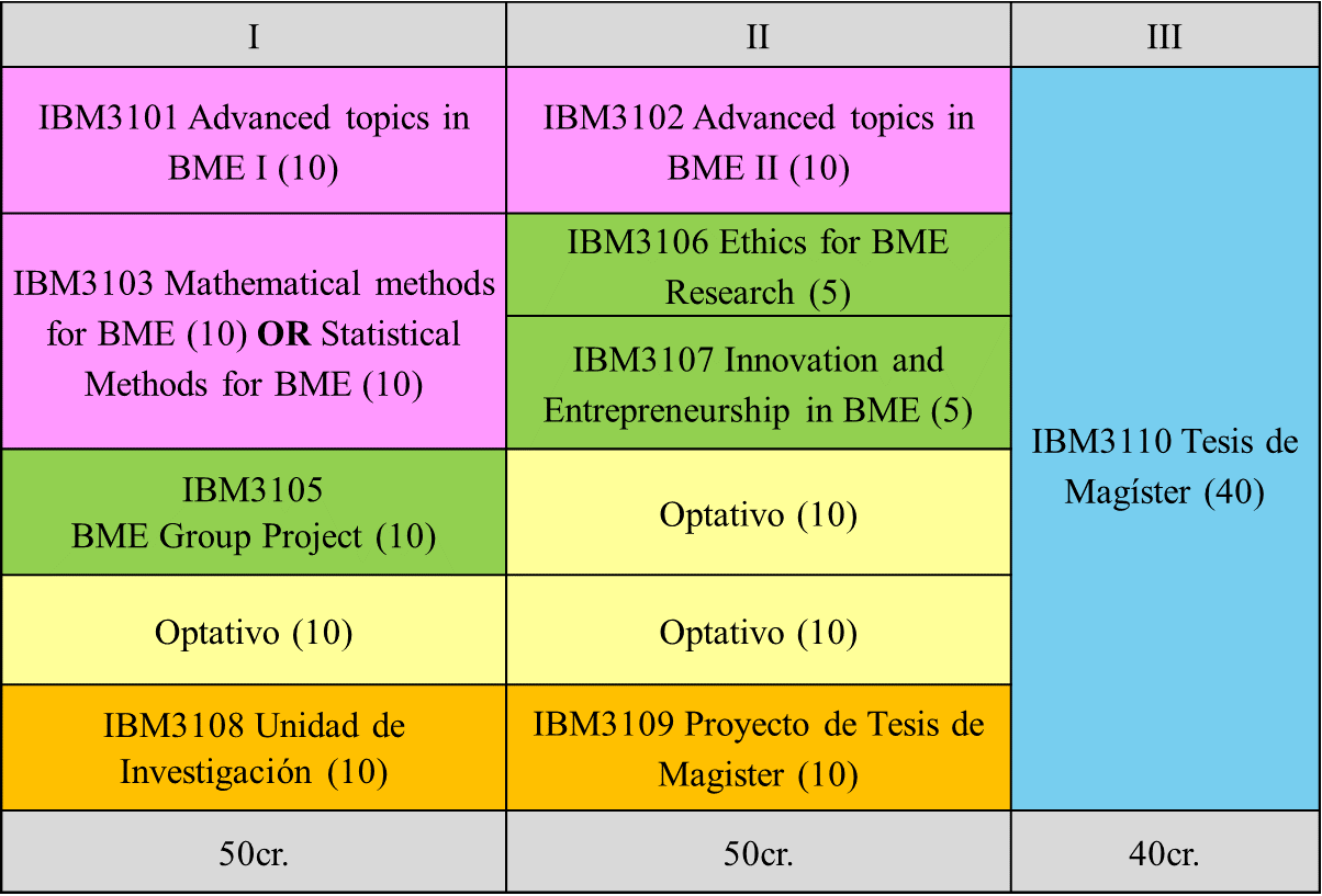 La dedicación al Magíster en Ingeniería Biológica y Médica es exclusiva, con una duración teórica de 3 semestres y un total de 140 créditos UC, de los cuales 70 corresponden a cursos mínimos, 30 a cursos optativos y 40 a Tesis. Los créditos son la expresión cuantitativa del trabajo académico efectuado por el estudiante, necesario para alcanzar los objetivos y logros de aprendizaje de cada actividad curricular. Un crédito UC equivale a una hora de trabajo por semana durante un semestre.